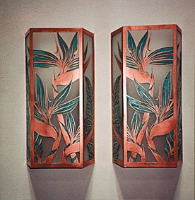 Paradise LightsTM: a new dimension in lighting. The source for classic tropical Hawaiian lighting designs. Our company goal is to bring a warm feeling of Aloha to your environment, using Hawaiian floral and ocean artwork cut into pure copper, highlighted with true patina vertigri, and illuminated through etched high strength glass. Copper will age and survive over time like no other metal, withstanding salt air and constant exposure to the severest climates; gradually changeing to a rich natural burnished tone. This aged look makes copper the best choice for exposed exterior metal surfaces.