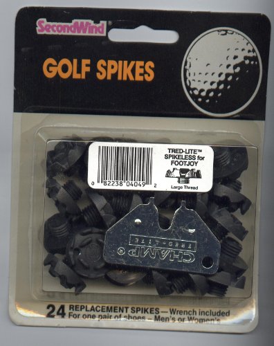 Tred-Lite Spikeless for Footjoy Large Tread Golf Spikes. 24 Per pkg. includes Wrench. For one pair of shoes - Men's or Womens - Large Thread - Spikes are intended for use only on dry, flat grassy surfaces. They are not intended for use on damp or hilly surfaces, because they may not provide adequate traction on such surfaces. They are not intended for use on hard surfaces such as concrete, ice, rocks, hardwood, marble, or tile floors, etc., because they are made of hard polyurethane that may cause them to slip or skate on such surfaces. Use on any of these surfaces may cause the user to slip and fall and substain serious injuries.